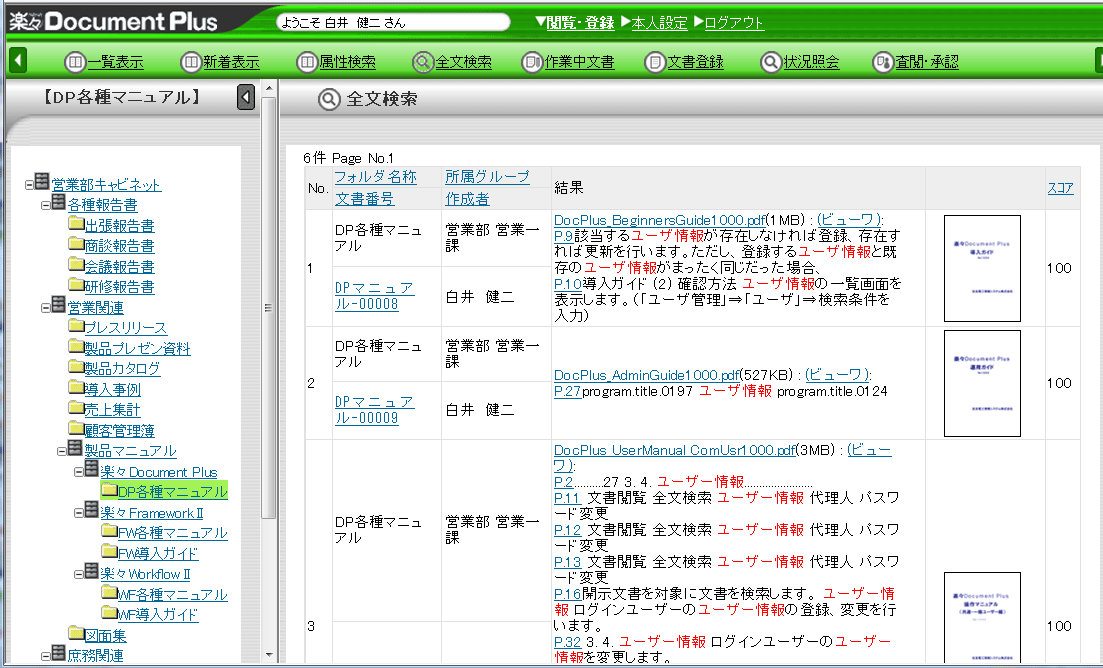 今回販売を開始する「楽々Document Plus Ver.2.0」では、登録された文書ファイルを軽快に参照するためのビューワをPDFベースのビューワに刷新しました。また、全文検索の結果一覧に、ヒットした文書ファイルのサムネイル(*1)が表示される機能を追加しました。
